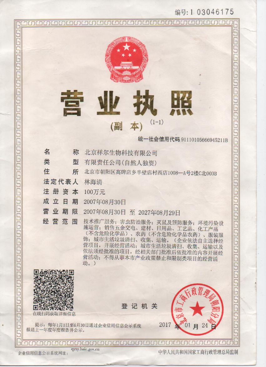 北京祥爾生物科技有限公司是經(jīng)過(guò)全國(guó)衛(wèi)生產(chǎn)業(yè)企業(yè)管理協(xié)會(huì)有害生物管理協(xié)會(huì)。北京市愛(ài)衛(wèi)會(huì)登記備案、有害生物防治協(xié)會(huì)中核成立的為為客戶(hù)解決生產(chǎn),服務(wù)過(guò)程中有關(guān)城市害蟲(chóng)(蒼蠅、蚊子、蟑螂,老鼠、螞蟻以及消毒衛(wèi)生服務(wù))防控問(wèn)題而設(shè)立的專(zhuān)業(yè)技術(shù)服務(wù)機(jī)構(gòu)。日前在北京,河北、內(nèi)蒙古、遼寧、吉林等地共設(shè)有5家分公司,公司擁有行業(yè)等級(jí)資質(zhì),全國(guó)等級(jí)資質(zhì)備案、北京防治協(xié)會(huì)等級(jí)備案,所有員工均勻從業(yè)資格證、健康證、學(xué)歷證書(shū)。